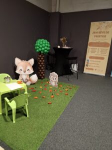 Une décoration automnale, des supports en bois hérisson et renard sur-mesure, du gazon synthétique, des glands, des feuilles, un arbre sculpté en ballons… L’automne et ses belles couleurs orangées !